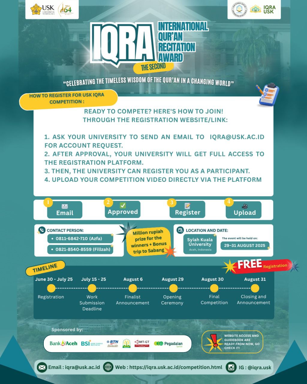2nd International Qur'an Recitation Award under IQRA-USK. This competition is a celebration of the eternal beauty of the teachings of the Qur'an. The theme "Celebrating the Timeless Wisdom of the Qur'an in a Changing World" encapsulates the essence of The IQRA - USK as a platform that embraces the profound teachings of Al-Qur'an to foster unity, mutual understanding, and inspiration among participants and the wider Islamic community. The event will be held on 29 until 31 August 2025.